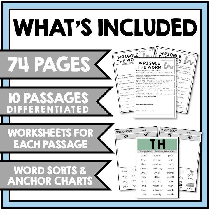 Digraph - PHONICS - Reading Passages + Worksheets sh ch th wh ph qu kn wr ck ng